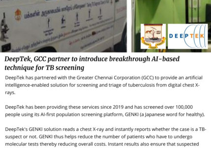 DeepTek has partnered with the Greater Chennai Corporation (GCC) to provide an artificial intelligence-enabled solution for screening and triage... 16 Feb DeepTek, GCC partner to introduce breakthrough AI-based technique for TB screening | AIML | 0 DeepTek has partnered with the Greater Chennai Corporation (GCC) to provide an artificial intelligence-enabled solution for screening and triage...