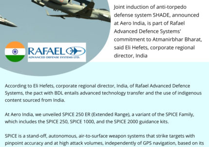 Joint induction of anti-torpedo defense system SHADE, announced at Aero India, is part of Rafael Advanced Defence Systems' commitment... 16 Feb Fully committed to India’s defense endeavors, says Rafael’s Eli Hefets | AIML | 0 Joint induction of anti-torpedo defense system SHADE, announced at Aero India, is part of Rafael Advanced Defence Systems' commitment...