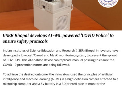 22 February 2021 | News Indian Institutes of Science Education and Research (IISER) Bhopal innovators have developed a low-cost... 24 Feb IISER Bhopal develops AI-ML powered ‘COVID Police’ to ensure safety protocols | AIML | 0 22 February 2021 | News Indian Institutes of Science Education and Research (IISER) Bhopal innovators have developed a low-cost...