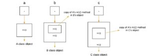 Explanation : In above program, both the class A(super class) and B(sub class) have a common variable ‘x’. Now we make object of class B, referred by ‘a’ which is of type of class A. Since variables are not overridden, so the statement “a.x” will always refer to data member of super class.