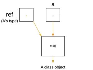 2. Now a reference of type A, called ref, is also declared, initially it will point to null.