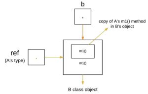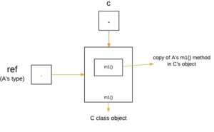 3. Now we are assigning a reference to each type of object (either A’s or B’s or C’s) to ref, one-by-one, and uses that reference to invoke m1( ). As the output shows, the version of m1( ) executed is determined by the type of object being referred to at the time of the call.