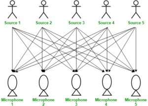 Here, There is a party going into a room full of people. There is ‘n’ number of speakers in that room and they are speaking simultaneously at the party. In the same room, there are also ‘n’ number of microphones placed at different distances from the speakers which are recording ‘n’ speakers’ voice signals. Hence, the number of speakers is equal to the number must of microphones in the room.