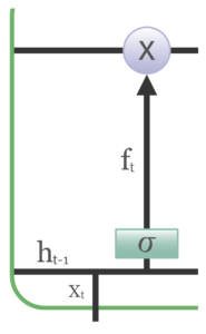 - Forget Gate: The information that no longer useful in the cell state is removed with the forget gate. Two inputs x_t (input at the particular time) and h_t-1 (previous cell output) are fed to the gate and multiplied with weight matrices followed by the addition of bias. The resultant is passed through an activation function which gives a binary output. If for a particular cell state the output is 0, the piece of information is forgotten and for the output 1, the information is retained for the future use.