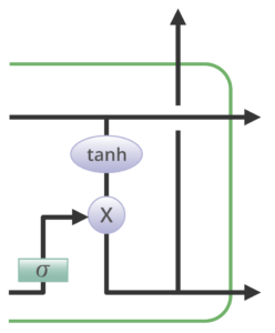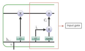 - Input gate: Addition of useful information to the cell state is done by input gate. First, the information is regulated using the sigmoid function and filter the values to be remembered similar to the forget gate using inputs h_t-1 and x_t. Then, a vector is created using tanh function that gives output from -1 to +1, which contains all the possible values from h_t-1 and x_t. Atlast, the values of the vector and the regulated values are multiplied to obtain the useful information